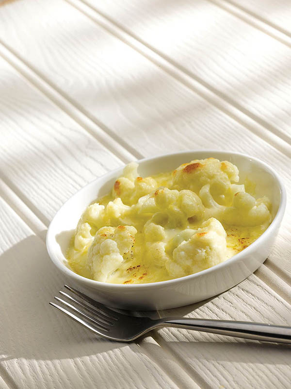 - Cover cauliflower with cheese sauce and sprinkle remaining cheese on top