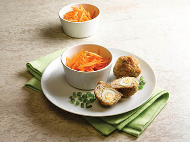 - Roll the chicken mix around the cooled eggs to make 2 small meatballs, then fry these in the remaining oil